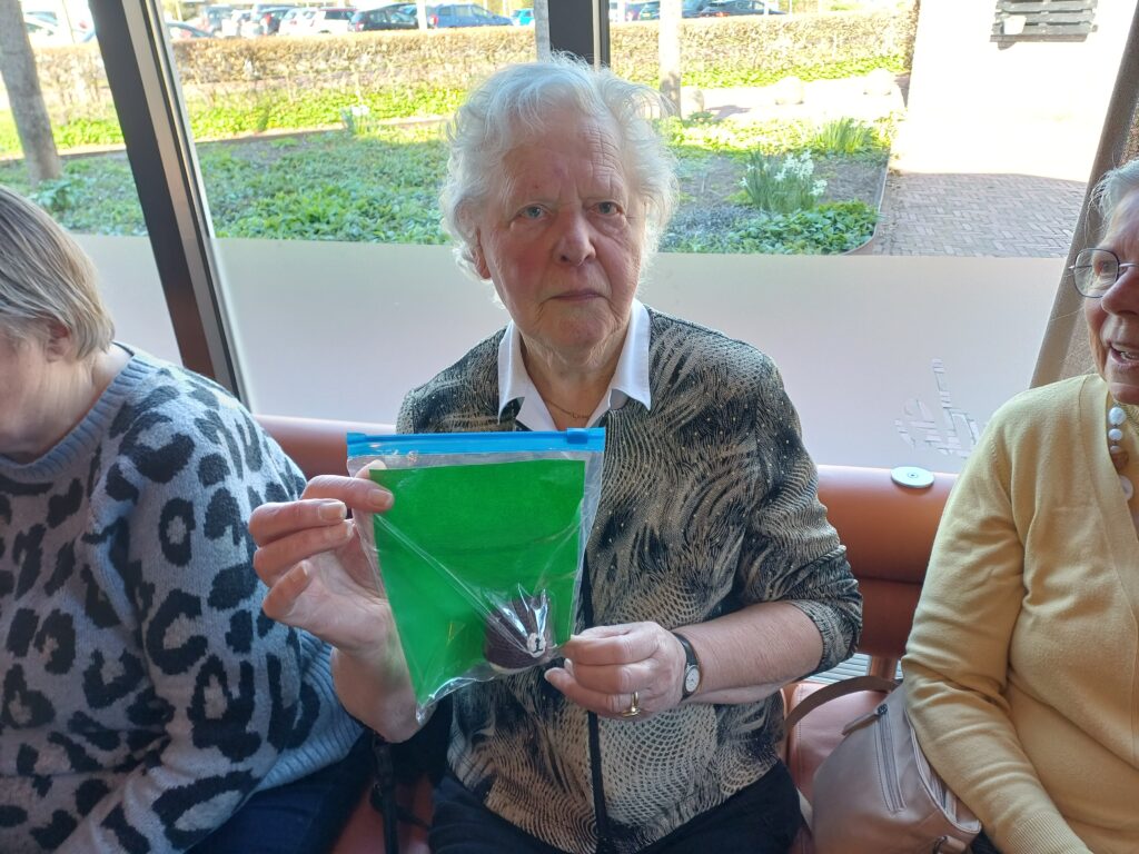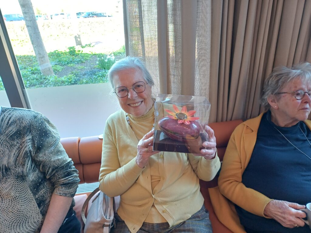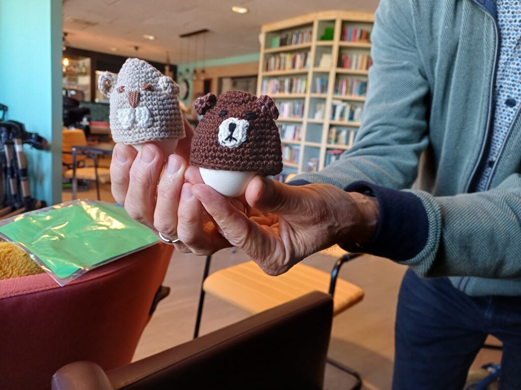Lia verraste ons allemaal met een warmhoudertje voor het paasei: zelf gehaakt en voor iedereen een exemplaar beschikbaar. Er was ook nog een prachtig chocolade ei, dat werd verloot. Alles na Pasen, maar wel in voorjaarssfeer.